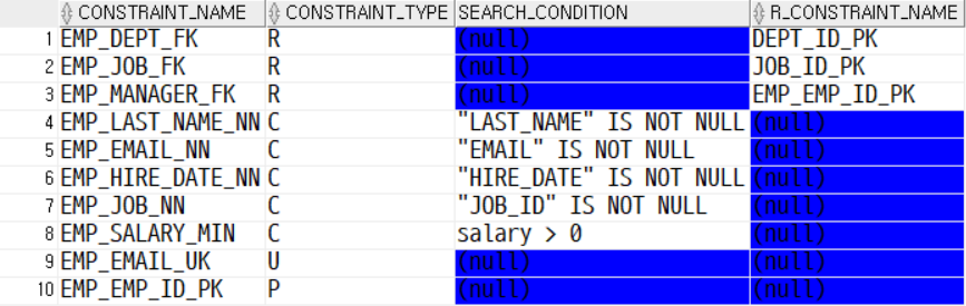 SELECT CONSTRAINT_NAME, CONSTRAINT_TYPE, SEARCH_CONDITION, R_CONSTRAINT_NAME