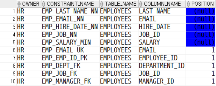 -- 컬럼의 제약조건을 조회출력 (USER_CONS_COLUMNS)